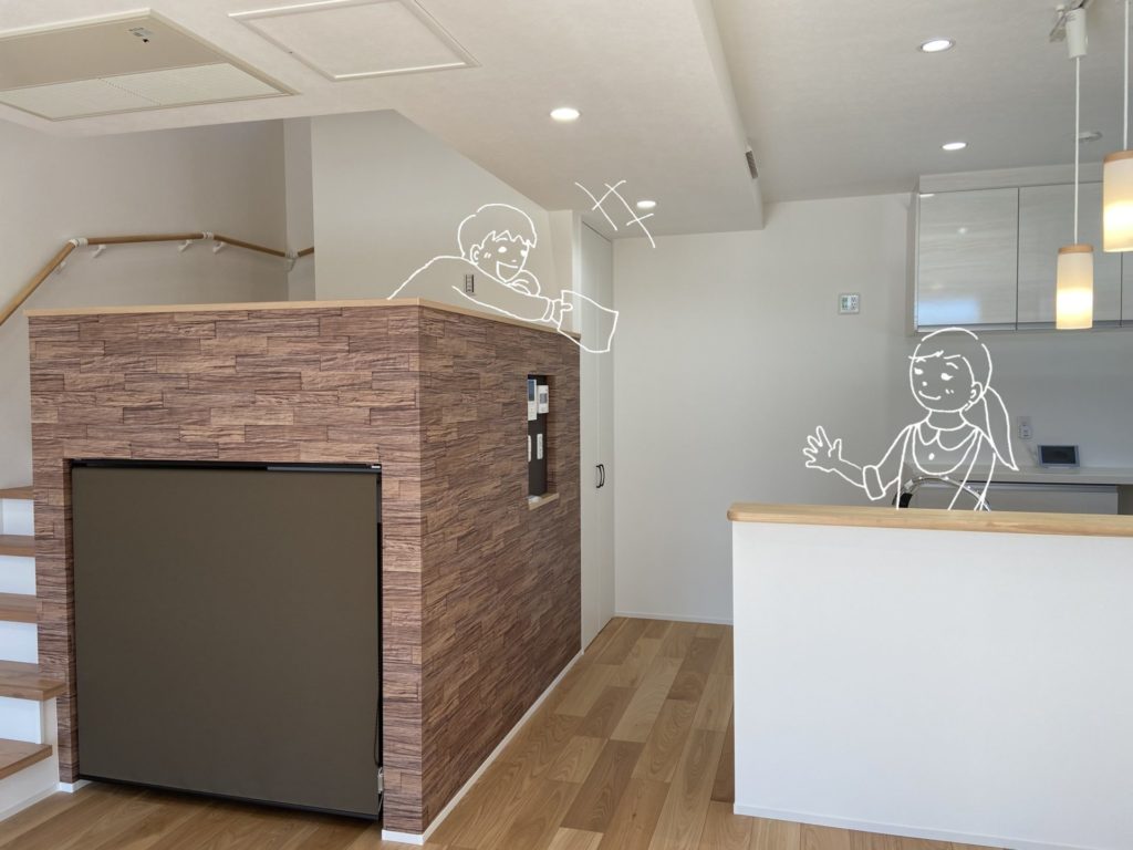 スキップフロアにはデスクカウンターを設置し、勉強スペースやワークスペースとしても利用でき、キッチンの真横に配置されているので、キッチンで家事中のママもスキップフロアにいる家族とコミュニケーションを取りながら家事を進められます。