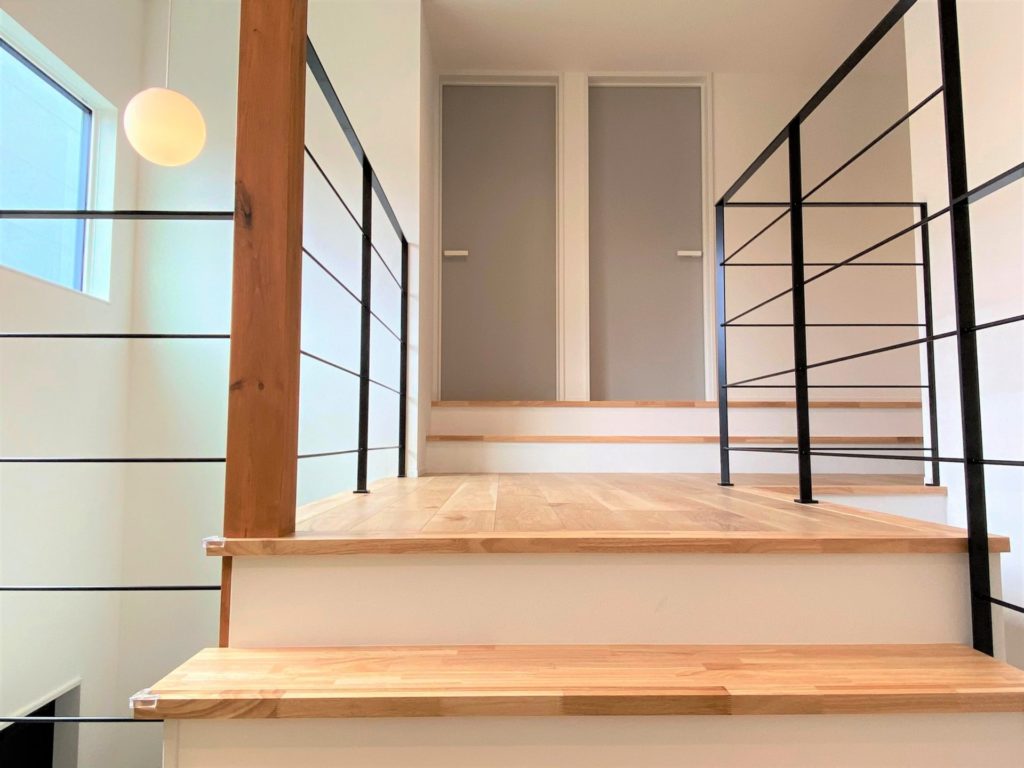朝陽を採りこむ吹抜けのある玄関とつながるのは、2階へと続く階段の途中に位置するスキップフロア。