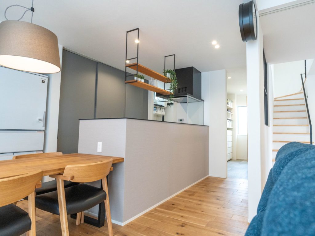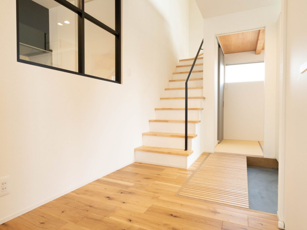 玄関・LDK・スキップフロアがつながり、大空間となってもエアコン1台で快適に過ごせるのは断熱性・気密性が高い高性能住宅ならでは。
